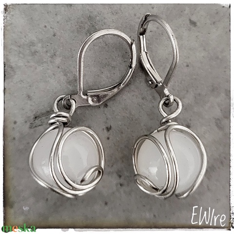 Fehér achát fülbevaló, Orvosi fém fülbevaló, drót fülbevaló, ásványgolyós fülbevaló
