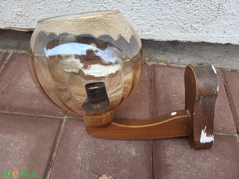 Vintage, retro, fából készült falikar, falilámpa irizáló, füstüveg búrával