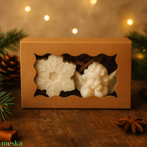 Téli békesség ajándékcsomag – Angyalszárny és Hópehely kézműves gyertya