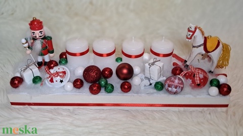 Gyertyás adventi asztaldísz klasszikus zöld-fehér-piros színekben