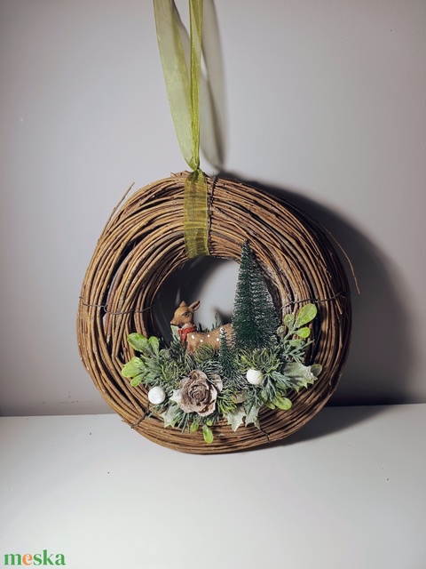Szarvas figurás ajtódísz kopogtató erdei karácsonyi ünnepi fa koszorú alapon