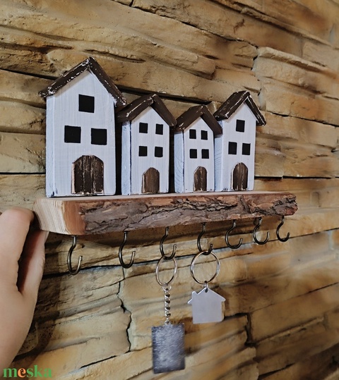 Házikós fali kulcstartó,kis polccal rusztikus fán