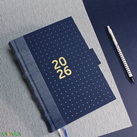 2026 heti tervező / határidőnapló - kék farmer és vászon - pöttyös - matt arany felirattal