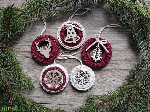 Horgolt karácsonyfadísz szett bordó-natúr színben