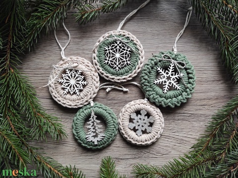 Horgolt karácsonyfadísz szett bézs-eukaliptusz színben