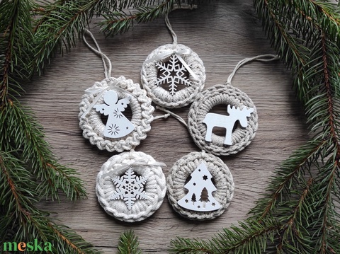Horgolt karácsonyfadísz szett natúr-bézs színben