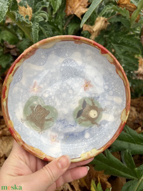 Kézzel festett kerámia tál – “Vidám békák” 15 cm