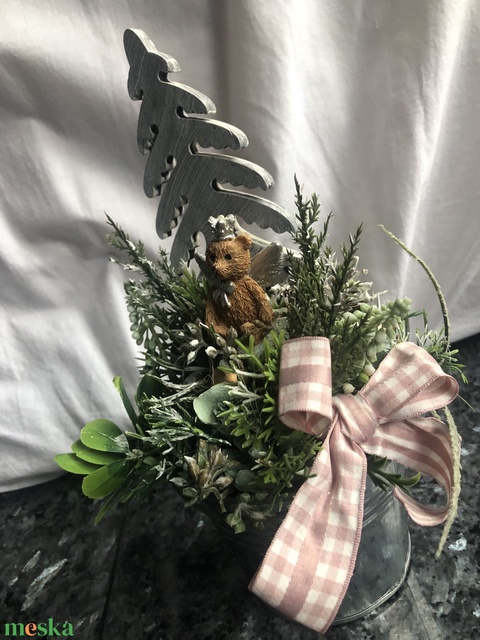 Karácsonyi asztaldísz kis fém vödörben maci királyfi