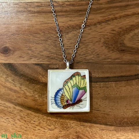 Herendi mentett darabok - porcelán nyaklánc - négyzet medál nemesacél lánccal, pillangós