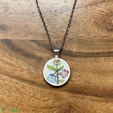 Herendi mentett darabok - nemesacél nyaklánc virágos porcelánnal