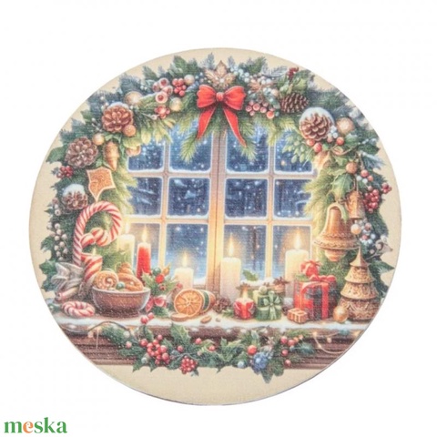Nyomtatott fa tábla koszorú közép Karácsonyi ablak mintával 11,8cm (KARÁCSONY)