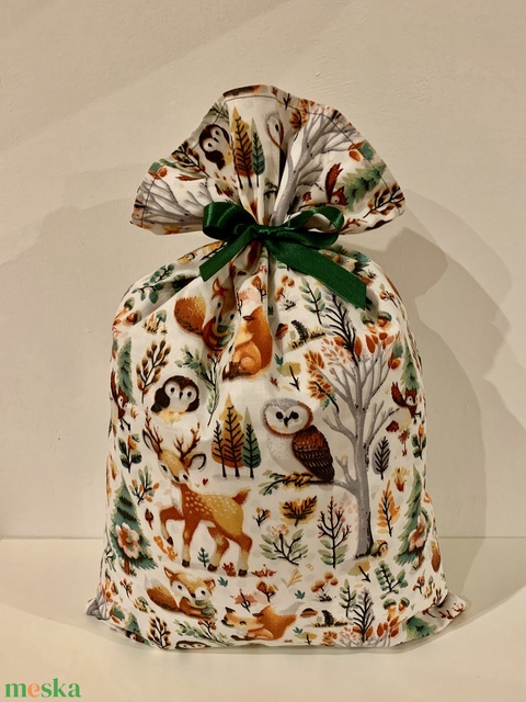 Készleten! Bélelt, karácsonyi, erdei állatos ajándékátadó textil zsák