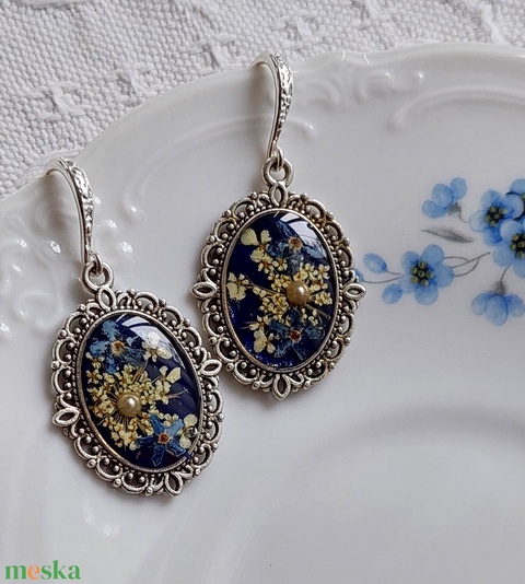 Kék nefelejcs virágos fülbevalók. Egyedi vintage stílusú gyantaékszer.