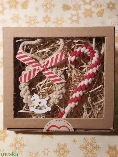 Makramé ajándékdoboz karácsonyi díszekkel