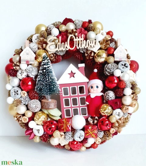 - Anyaga: koszorú alap, figura, felirat, házikó, fenyőfa, termések, karácsonyi gömbök