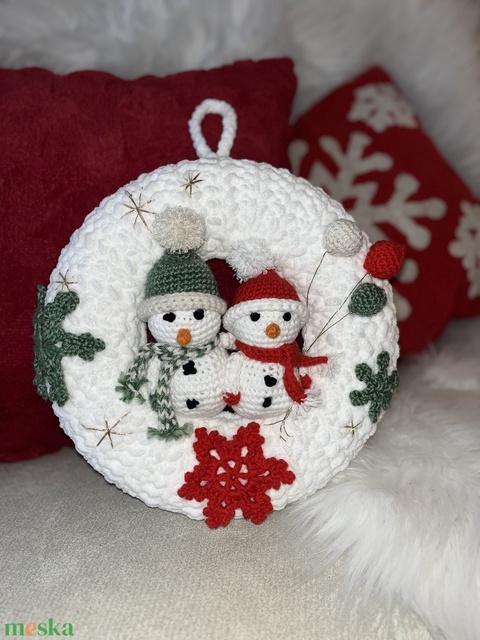 Horgolt karácsonyi ajtódísz – Két hóemberrel, Kézzel készült téli dekoráció