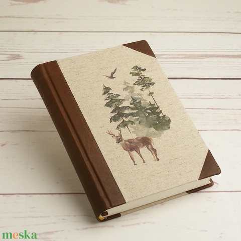 Évi kérései alapján készülő egyedi vadásznapló. Bőr gerinc és sarkok, nyomtatott natúr vászon borító, egyedi felirat
