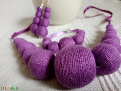 Lila textilbogyó ékszerszett, fonal nyaklánc, golyó nyaklánc, fonal fülbevaló