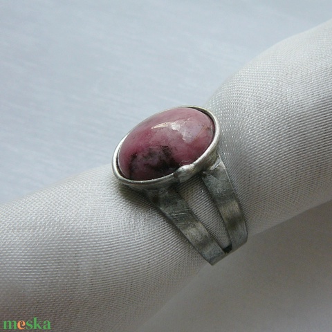 A gyűrű tiffany technikával készült rodonit és ólommentes, ezüsttartalmú ón felhasználásával. A díszítés szintén saját készítésű, nem tartalmaz gyári elemeket. A fémrészt óezüstre patináztam, lekezeltem antioxidánssal és lelakkoztam, hogy sokáig szép maradjon.
