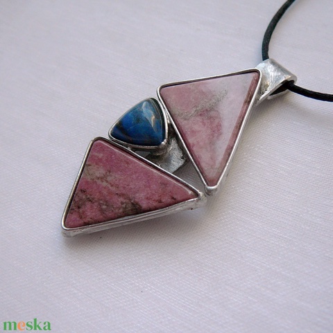 A medál Tiffany technikával készült rodonit, lápisz lazuli és ólommentes, ezüsttartalmú ón felhasználásával. A díszítés szintén saját készítésű, nem tartalmaz gyári elemeket. A fémrészt óezüstre patináztam, lekezeltem antioxidánssal és lelakkoztam, hogy sokáig szép maradjon.
