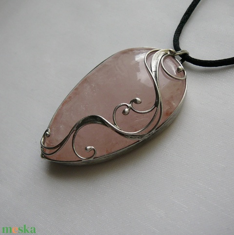 A medál Tiffany technikával készült rózsakvarc és ólommentes, ezüsttartalmú ón felhasználásával. A díszítés szintén saját készítésű, nem tartalmaz gyári elemeket. A fémrészt óezüstre patináztam és lelakkoztam, hogy sokáig szép maradjon.