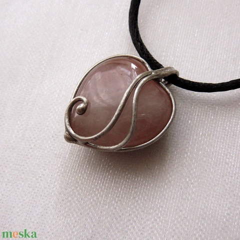 A medál Tiffany technikával készült rózsakvarc és ólommentes, ezüsttartalmú ón felhasználásával. A díszítés szintén saját készítésű, nem tartalmaz gyári elemeket. A fémrészt óezüstre patináztam és lelakkoztam, hogy sokáig szép maradjon.