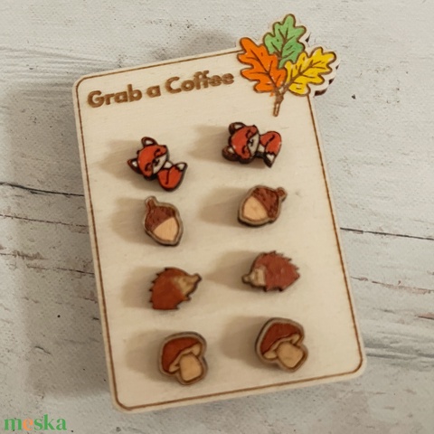 Őszi bedugós fülbevaló szett – gomba, makk, róka és süni mintával