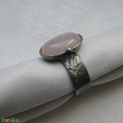 A gyűrű Tiffany technikával készült rózsakvarc és ólommentes, ezüsttartalmú ón felhasználásával. A fémrészt óezüstre patináztam és lelakoztam, hogy sokáig szép maradjon.