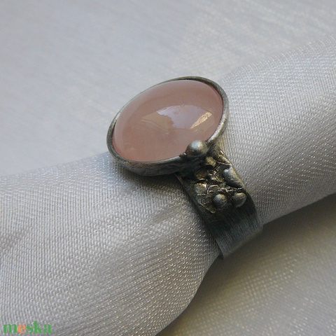 A gyűrű Tiffany technikával készült rózsakvarc és ólommentes, ezüsttartalmú ón felhasználásával. A fémrészt óezüstre patináztam és lelakoztam, hogy sokáig szép maradjon.