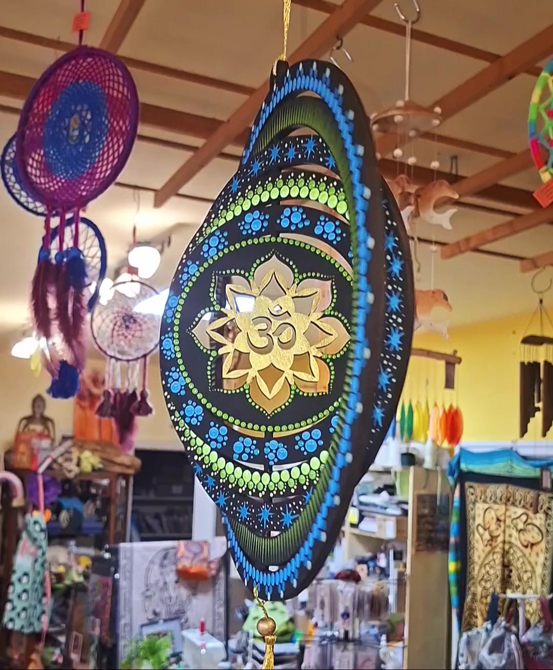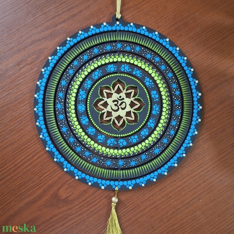 Különleges, 30 cm átmérőjű kézzel festett fa szélforgó az OM ősi szimbólumát és a pontozott mandalafestés varázsát ötvözi. A kék, zöld és arany színek harmonikus játéka egy finoman pulzáló, kozmikus spirált idéz, amely minden térbe békét, friss energiát és spirituális fókuszt visz.