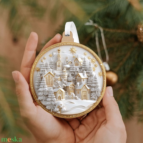 Ez a karácsonyfadísz egy letisztult, fehér–arany havas falucskát ábrázol, elegáns arany kördísszel keretezve. A templom és a két apró házikó finom részletei, valamint a harmonikus színvilág modern, békés ünnepi hangulatot teremtenek.