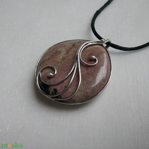 A medál Tiffany technikával készült rodonit és ólommentes, ezüsttartalmú ón felhasználásával. A díszítés szintén saját készítésű, nem tartalmaz gyári elemeket. A fémrészt óezüstre patináztam, lekezeltem antioxidánssal és lelakkoztam, hogy sokáig szép maradjon.