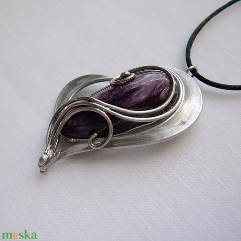 A medál tiffany technikáva készült csaroit ( karoit ) és ólommentes, ezüsttartalmú ón felhasználásával. A díszítés szintén saját készítésű, nem tartalmaz gyári elemeket. A fémrészt óezüstre patináztam, lekezeltem antioxidánssal és lelakkoztam, hogy sokáig szép maradjon.
