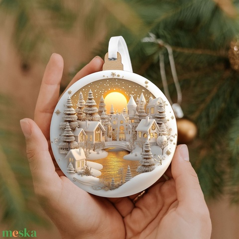 Ez a karácsonyfadísz egy fehér–arany téli tájat ábrázol, középpontjában egy nagy, aranyló teliholddal. A havas hegyek és a kis falurészlet letisztult, békés hangulatot adnak a dísznek, amely modern és elegáns stílusban illeszkedik az ünnepi dekorációhoz.