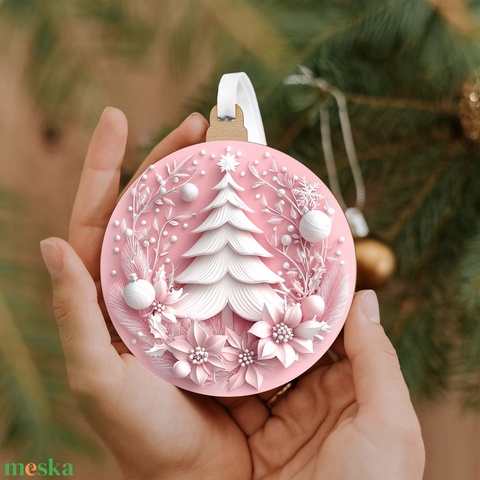 Ez a karácsonyfadísz egy lágy rózsaszín háttér előtt megjelenő, elegáns fehér fenyőt ábrázol, melyet finom téli virágok és apró díszítőelemek vesznek körül. A harmonikus rózsaszín–fehér színvilág modern, letisztult és mégis ünnepi hangulatot teremt, így bármely karácsonyfán különleges látványt nyújt.