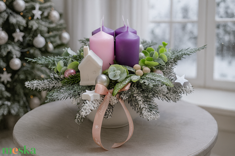 Ezüst-rózsaszín adventi aztaldísz kerámia templommal