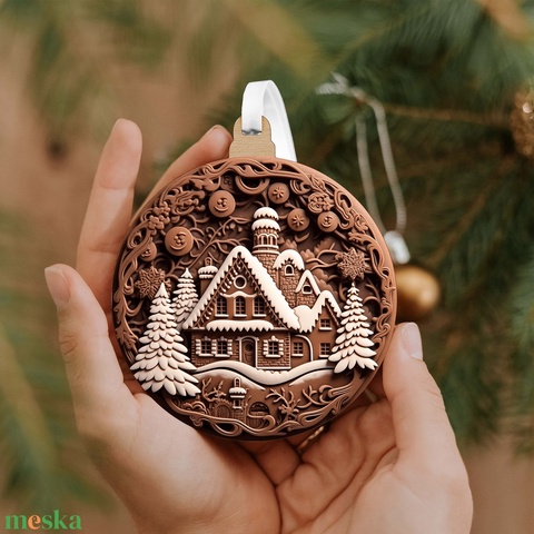 Ez a karácsonyfadísz egy hangulatos, mézeskalács stílusú házikót ábrázol, hóval borított tetőkkel és részletgazdag téli erdei környezettel. A barna és fehér árnyalatok a frissen sütött mézeskalács hangulatát idézik, míg a finoman kidolgozott fenyők és a díszes keret játékos, mégis meghitt karácsonyi atmoszférát teremtenek. A központi ház tornyocskája különleges, mesebeli karaktert ad a dísznek.