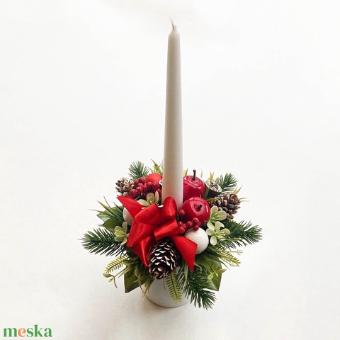 Gyertyás karácsonyi asztaldísz piros masnival