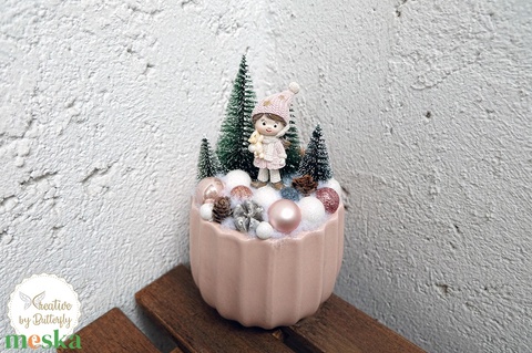 - Anyaga: üveggömbök, műfenyő, kerámiakaspó, kislány