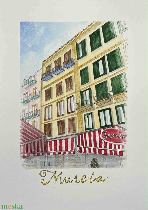 Spanyolország, Murcia, utcarészlet piros-fehér napernyőkkel