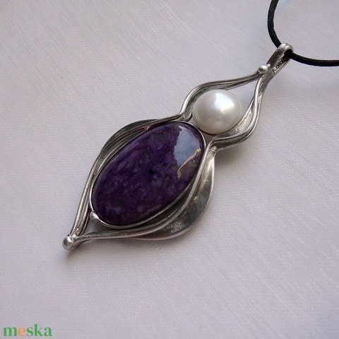 A medál tiffany technikáva készült csaroit ( karoit ) és ólommentes, ezüsttartalmú ón felhasználásával. A díszítés szintén saját készítésű, nem tartalmaz gyári elemeket. A fémrészt óezüstre patináztam, lekezeltem antioxidánssal és lelakkoztam, hogy sokáig szép maradjon.