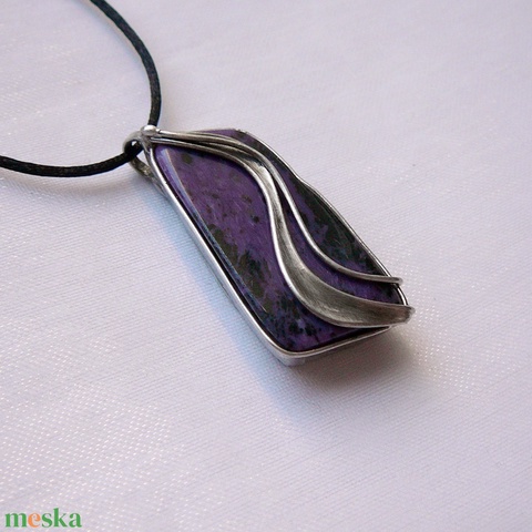 A medál tiffany technikáva készült csaroit ( karoit ) és ólommentes, ezüsttartalmú ón felhasználásával. A díszítés szintén saját készítésű, nem tartalmaz gyári elemeket. A fémrészt óezüstre patináztam, lekezeltem antioxidánssal és lelakkoztam, hogy sokáig szép maradjon.