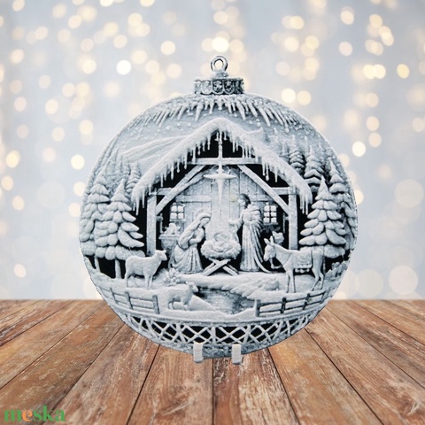 Ez a dísz nem csupán egy ünnepi dekoráció – egy emlékeztető arra a csendre, amelyben a remény született. A Szent Éjszaka egy klasszikus betlehemes jelenetet ábrázol: Mária, József és a kis Jézus az istállóban, fenyőfák között, hó alatt, állatok társaságában. A jelenet Hueforge technikával készült, így festés nélkül is lenyűgöző mélységet és kontrasztot ad a fény-árnyék játék.