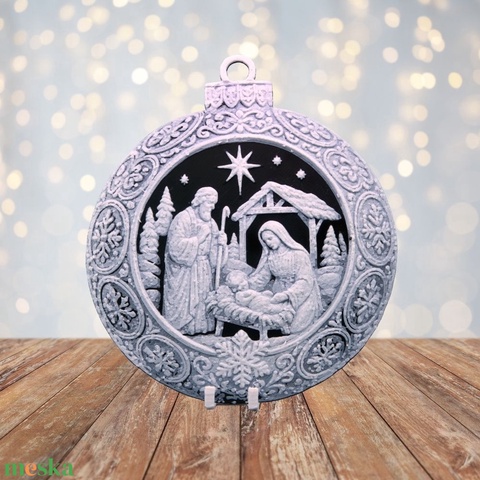 A Kezdet Fénye karácsonyfadísz a betlehemi istálló megható pillanatát idézi meg: Mária ölelő tekintete, József védelmező jelenléte, és a csillag, amely a világ új reményét hirdeti. A jelenetet ünnepi motívumok és díszes keret öleli körbe.