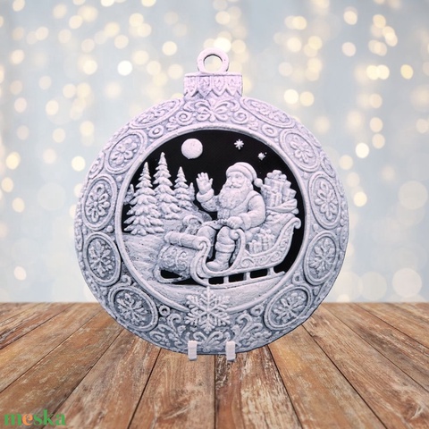A Télapó Útra Készül dísz a karácsonyi készülődés egyik legikonikusabb pillanatát örökíti meg: a Mikulás szánra ül, ajándékokkal megrakodva, és vidáman integet, mielőtt elindulna a világ gyermekeihez. A háttérben havas fenyves és csillagfényes égbolt teszi teljessé a mesés jelenetet.