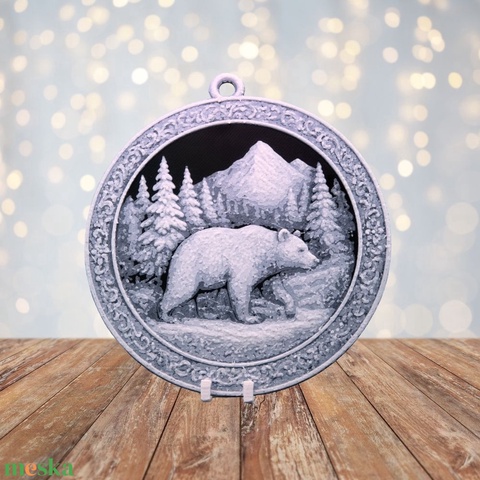 A Havas Vándor egy különleges dísz azoknak, akik a természet szépségét és erejét szeretnék az ünnepi dekorációba csempészni. A főszereplő egy medve, aki méltósággal lépked a hóval borított erdei ösvényen, háttérben havas hegycsúcsok és fenyvesek – egy valódi téli vadonba kalauzoló jelenet.