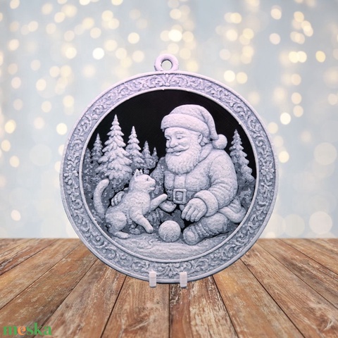 Mikulás és a Macska díszünk egy kedves, játékos jelenetet örökít meg: a Mikulás térdre ereszkedve mosolyog egy barátságos cicára, miközben körülöttük a hó borította fenyőerdő csendesen figyel. A szeretet és játékosság hangulata hatja át ezt az aprólékosan kidolgozott, bájos karácsonyi díszt.