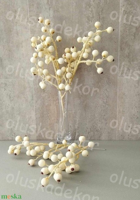 Bogyós ág, törtfehér színben, nyári, őszi, karácsonyi dekorációs mű növény, 30cm