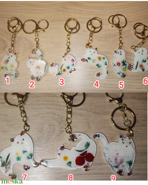 Kulcstartó "Macska" epoxigyantából, szárított virágokkal. 1 darab költsége.