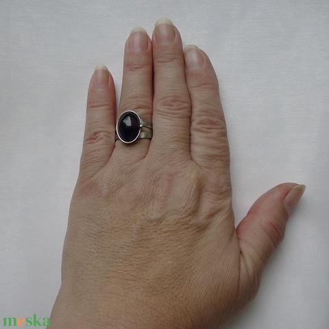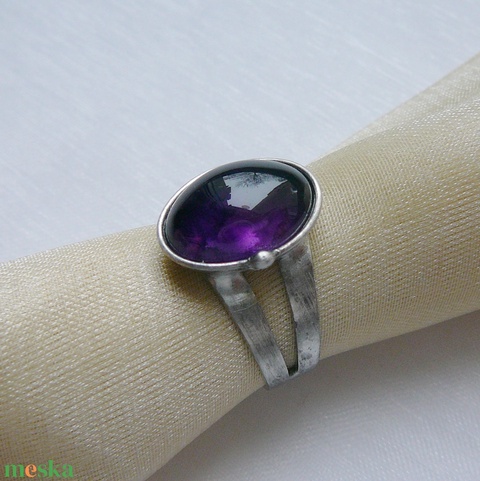 A gyűrű Tiffany technikával kézült ametiszt és ólommentes, ezüsttartalmú ón felhasználásával. A díszítés szintén saját készítésű, nem tartalmaz gyári elemeket. A fémrészt óezüstre patináztam, lekezeltem antioxidánssal és lelakkoztam, hogy sokáig szép maradjon.